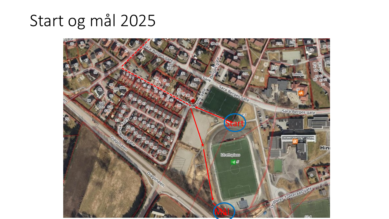 Merk at startnummerutlevering er ved utstyrsgarasjen på venstre side ved innkjøring til idrettsparken.